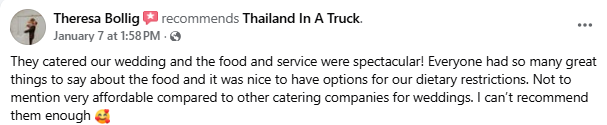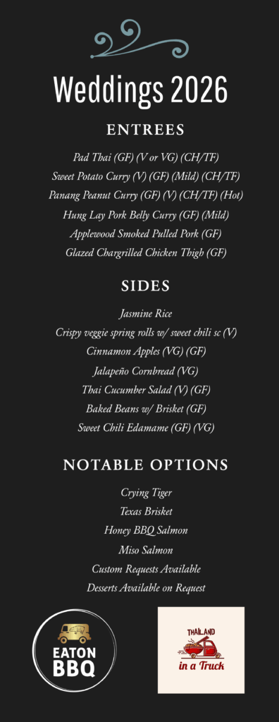 Starting 2025, we introduced double fusion wedding catering! Let us take care of your wedding with both Thailand in a Truck & Eaton BBQ. Serving from trucks or buffet/family style. Make it a day you will never forget. Contact us today for a custom quote.